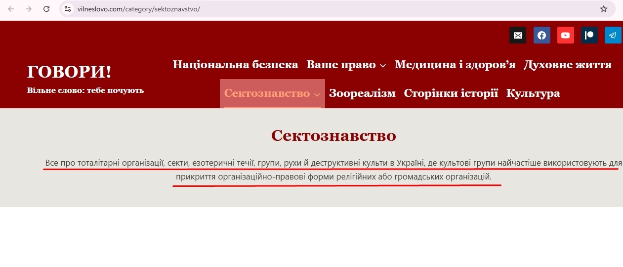 Публікує викривальні статті, де використовує терміни “деструктивний культ”, “тоталітарна секта”. Не юридичні, а ідеологічні ярлики, запозичені напряму з російських джерел.