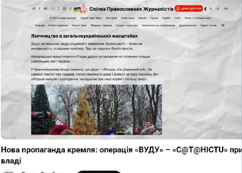 Є ресурс — СПЖ. СБУ накрила його за роботу на ФСБ. Цей ресурс написав статтю про те, що нібито Україна — язичницька країна, бо наш Президент записав Різдвяне звернення на фоні Дідуха.