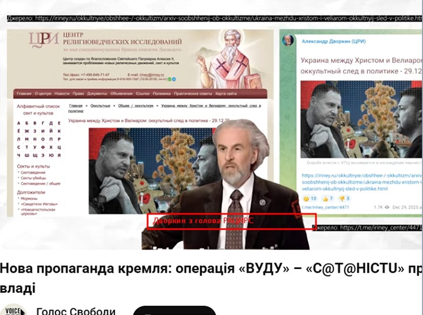 Хто замовник? Олександр Дворкін — голова російської структури РАЦИРС, яка є інструментом ФСБ для інформаційних диверсій. Його завдання — вигадувати «ворогів» (“секти”, “окультистів”) для дискредитації незручних кремлю сил.