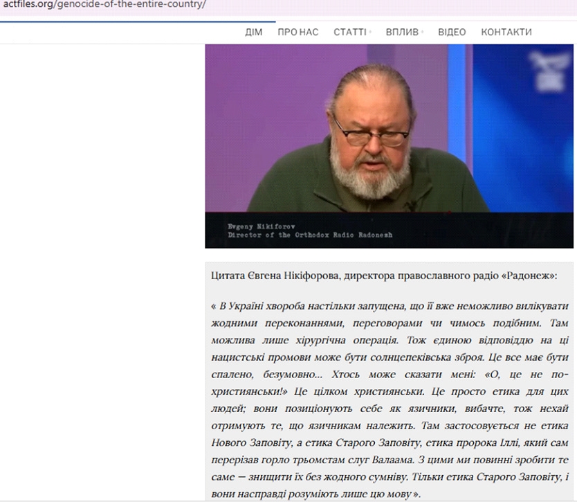 ЦИТУЮ те, що на скрині: “На Україні хвороба так запущена, що вже ніякими вмовляннями, переговорами, нічим там нічого це вилікувати неможливо. Там можлива тільки хірургія. Тому відповідь на ось ці виступи нацистів може бути тільки одна -сонцепьок. Це потрібно випалювати. Цілком так мені скажуть: “Ой, це не по-християнськи, по-християнськи цілком. Просто етика для цих людей. Вони ж самі себе позиціонують як язичники. Вибачте мене і отримайте як язичники. Тому для вас не новозавітна етика, а старозавітна”. Ільї пророка, який особисто взяв та перерізав горлянки 300 служителям Валаама. Із цими так само потрібно знищувати без всілякого сумніву. тільки старозавітна етика. І вони тільки це, тільки цю мову і розуміють.”