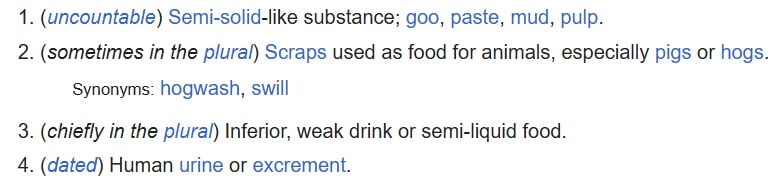 3.В сучасному інтернеті слово “слоп” повернулось також як щось пов’язане з низько-якісною їжею, а саме як “goyslop”, тобто спеціально шкідлива та низько-якісна їжа, яку рекламують та заставляють споживати щоби завдати шкоди популяції.