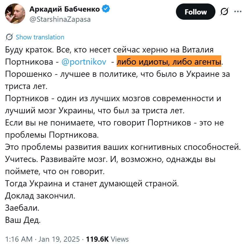 Очевидно, що так може вважати лише такий самий, як Віталій Портніков ідиот та аґент, що яскраво показує старшина армії порохоботов Аркадій Бабченко.