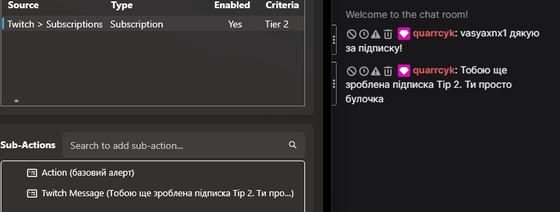 У попередніх статтях ми розібрали, що таке Streamer.bot, як створювати команди та працювати з тригерами. Сьогодні поговоримо про найцікавіше — Sub-Actions. Я наведу кілька прикладів їх використання і як в попередньому разі, постараюсь виділити основні, якими варто користуватись.