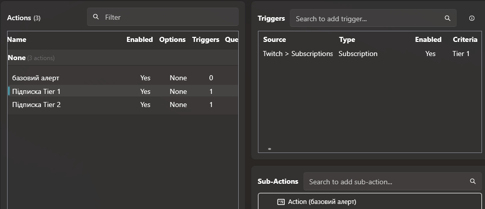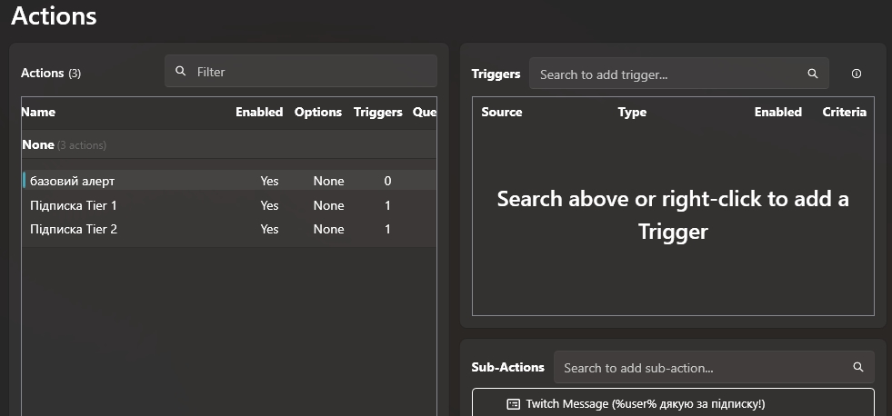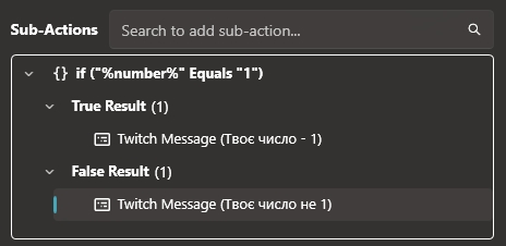 Sub-Action (Під-дія) - це конкретна дія, яку виконує Streamer.bot після спрацювання тригера. Якщо тригер - це "КОЛИ щось відбувається", то Sub-Action - це "ТОДІ зроби ось це".