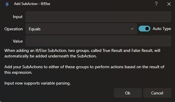 В Input треба вписати змінну/аргумент, з яким ми будемо працювати. Operation означає те, як саме порівнюватиметься наша змінна/аргумент зі значенням (Value). Список доступних операторів: