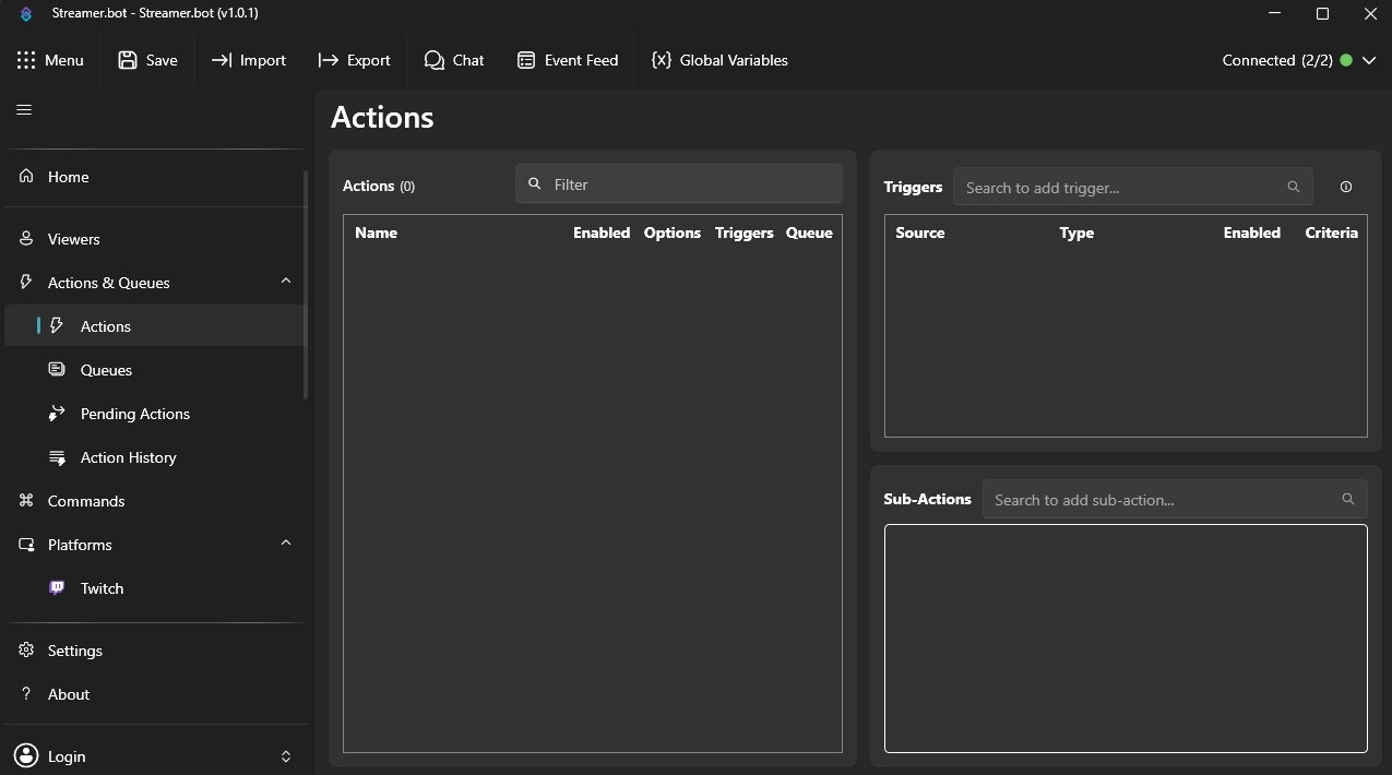 Після того, як ми відкрили застосунок (Streamer.bot.exe), можна побачити такий інтерфейс: