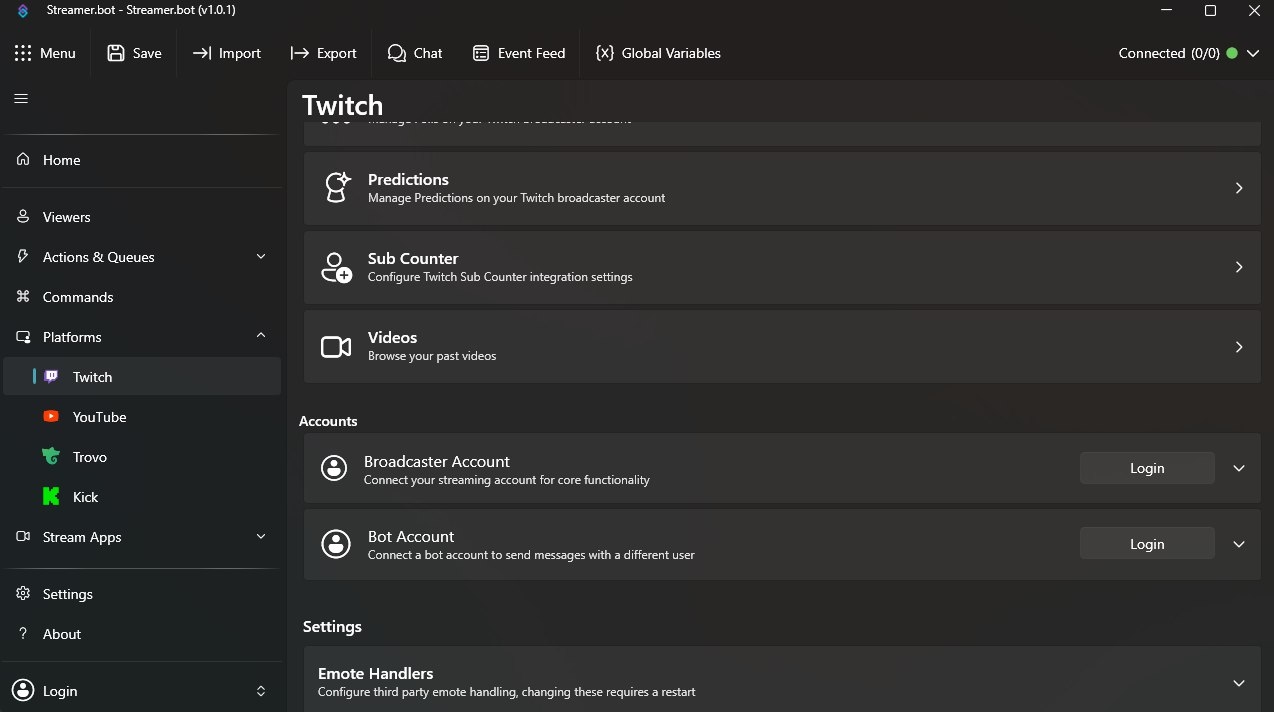 Існує дуже багато вкладок, які мають в собі ще чимало під вкладок. Давайте уявимо, що я хочу собі на канал додати команду в чаті, яка буде виводити "Привіт, це тестове повідомлення". У першу чергу, потрібно прив'язати свій Twitch-аккаунт до streamer.bot. Це можна зробити: Platforms -> Twitch