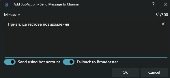 Оскільки нам потрібно вивести повідомлення в чат на Twitch, то ми беремо категорію Twitch -> Chat -> Send Message to Channel. З'явиться вікно, в яке ми можемо написати будь-який текст, який бот виведе в чат. Напишемо туди наше тестове повідомлення