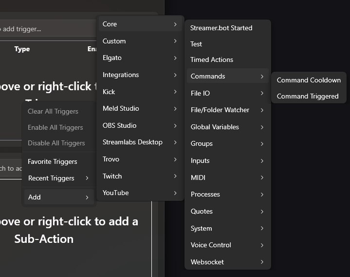 Triggers - це яким чином, ця дія буде викликатись (фоллов, сабка, команда в чаті, редімка, запуск OBS, тощо). Цих тригерів дуже багато і ми їх розглянемо в іншій статті. у Action може бути кілька тригерів Зробимо тригер на команду в чаті. Для цього натиснемо ПКМ і знайдемо Command Triggered