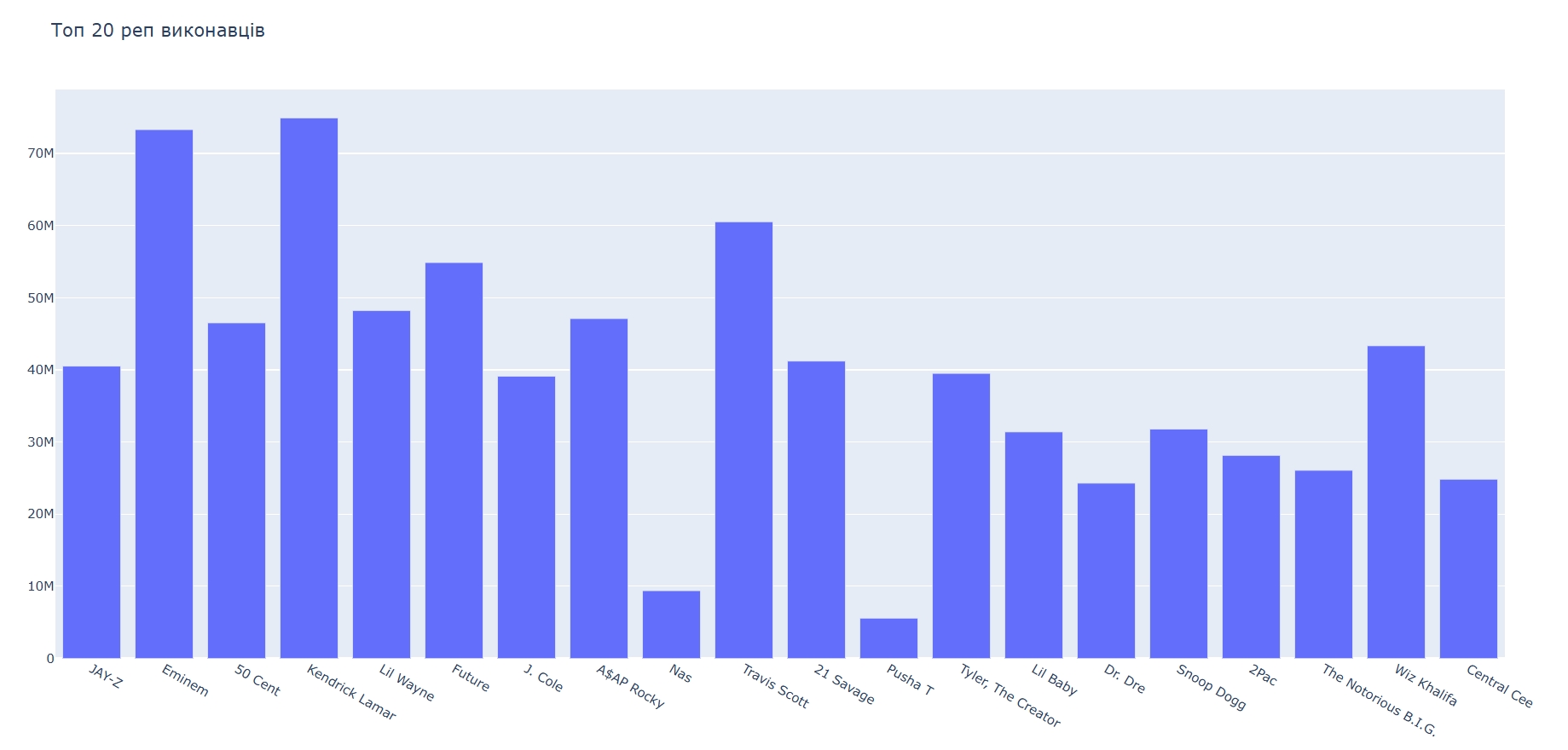 bar_figure.update_layout(title_text="Топ 20 реп виконавців")Відображаємо створений графік: