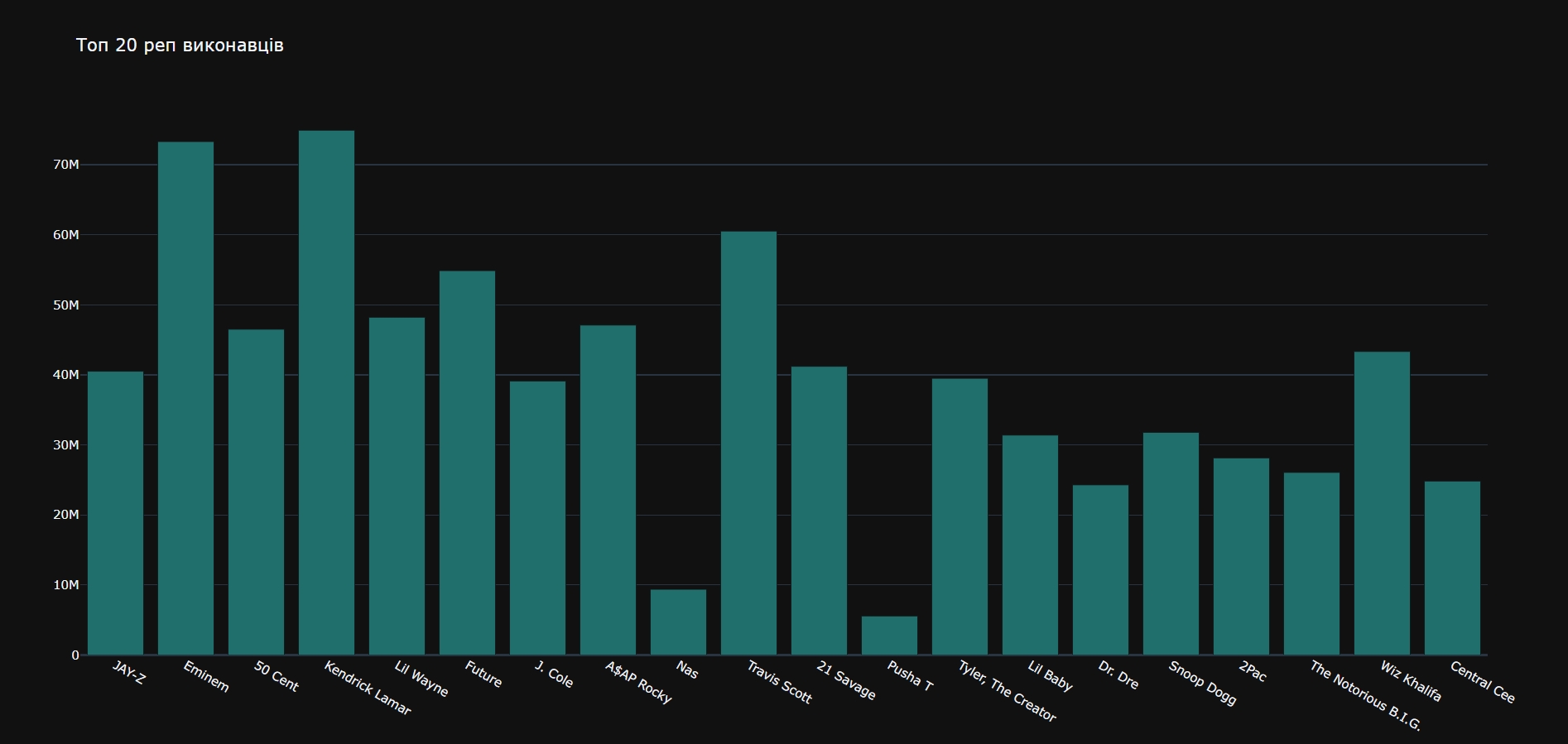 bar_figure.update_layout(title_text="Топ 20 реп виконавців", template="plotly_dark")Тема plotly_dark — це стандартна темна тема для plotly.