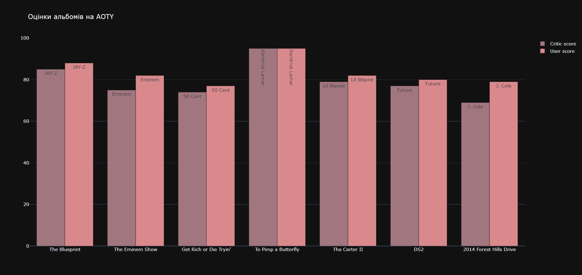 bar_figure.update_layout(title_text="Оцінки альбомів на AOTY", template="plotly_dark", barmode="group")Результат: