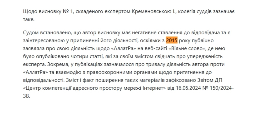 Окремо суд визнав неприпустимими ключові експертні висновки, подані проти «АЛЛАТРА». Було встановлено, що авторка одного з висновків, І. Кременовська, ще з 2015 року публічно висловлювала негативну позицію щодо руху та заявляла про свою діяльність, спрямовану на припинення його роботи, що свідчить про зацікавленість і упередженість експертки. Суд також зазначив відсутність самостійних досліджень у всіх експертних висновках і використання в них однакових, раніше опублікованих у мережі Інтернет текстів, що позбавляє такі експертизи доказової сили.