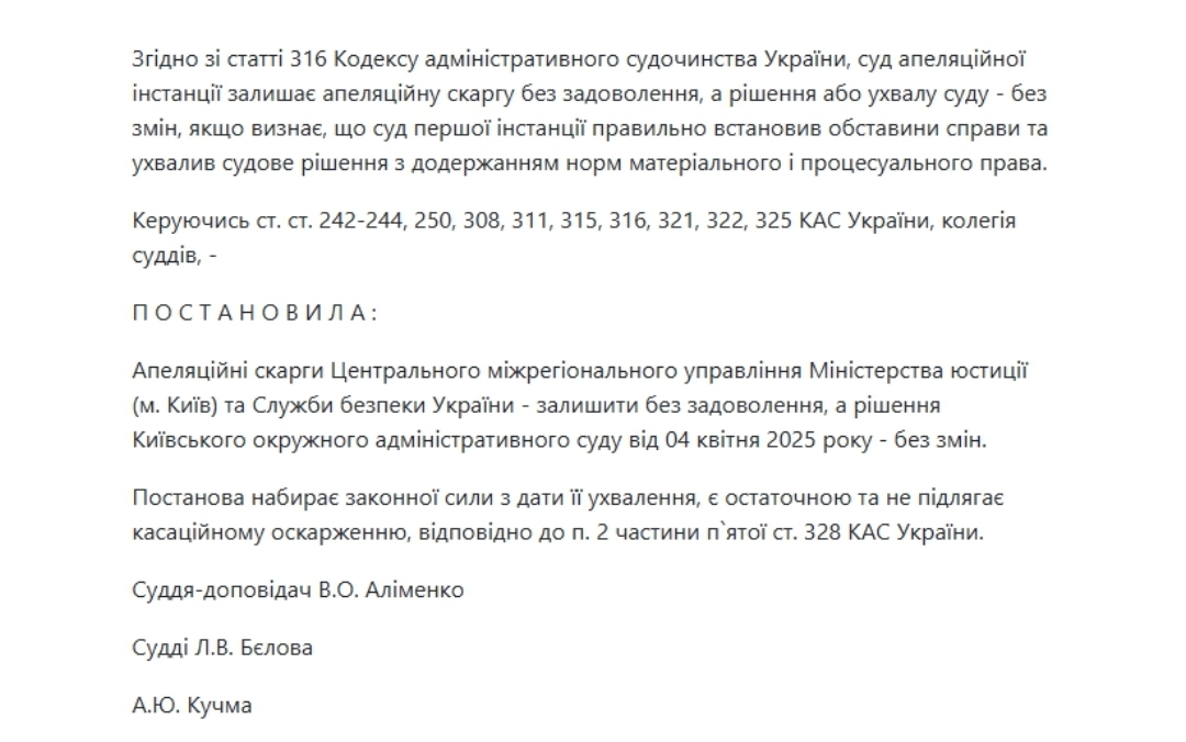 25 лютого 2026 року Шостий апеляційний адміністративний суд міста Києва постановою у справі № 640/362/23 підтвердив законність діяльності Громадської спілки «Міжнародний громадський рух «АЛЛАТРА», залишивши без задоволення апеляційні скарги Центрального міжрегіонального управління Міністерства юстиції України та Служби безпеки України у справі за позовом про заборону та примусову ліквідацію громадського об'єднання.