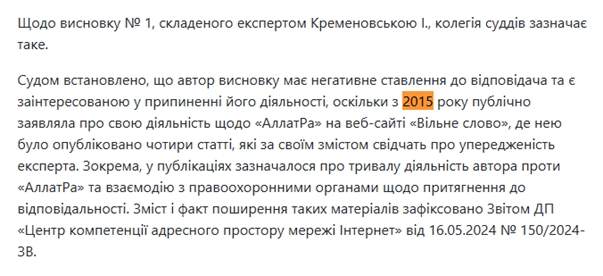 Окремо суд визнав неприпустимими ключові експертні висновки, представлені проти «АЛЛАТРА». Було встановлено, що автор одного з висновків, І. Кременовська, ще з 2015 року публічно висловлювала негативну позицію щодо руху і заявляла про свою діяльність, спрямовану на припинення його роботи, що свідчить про зацікавленість і упередженість експерта. Суд також зазначив відсутність самостійних досліджень у всіх експертних висновках і використання в них однакових і раніше опублікованих в мережі Інтернет текстів, що позбавляє такі експертизи доказової сили.
