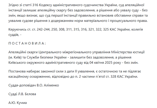 Постанова суду набрала законної сили в день її прийняття і є остаточною.