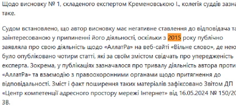 Окремо суд визнав неприпустимими ключові експертні висновки, представлені проти «АЛЛАТРА». Було встановлено, що автор одного з висновків, І. Кременовська, ще з 2015 року публічно висловлювала негативну позицію щодо руху і заявляла про свою діяльність, спрямовану на припинення його роботи, що свідчить про зацікавленість і упередженість експерта. Суд також зазначив відсутність самостійних досліджень у всіх експертних висновках і використання в них однакових і раніше опублікованих в мережі Інтернет текстів, що позбавляє такі експертизи доказової сили.