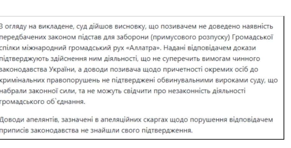 Суд прямо зазначив, що доказів того, що АЛЛАТРА поширює проросійські наративи або підтримує тероризм, не надано.