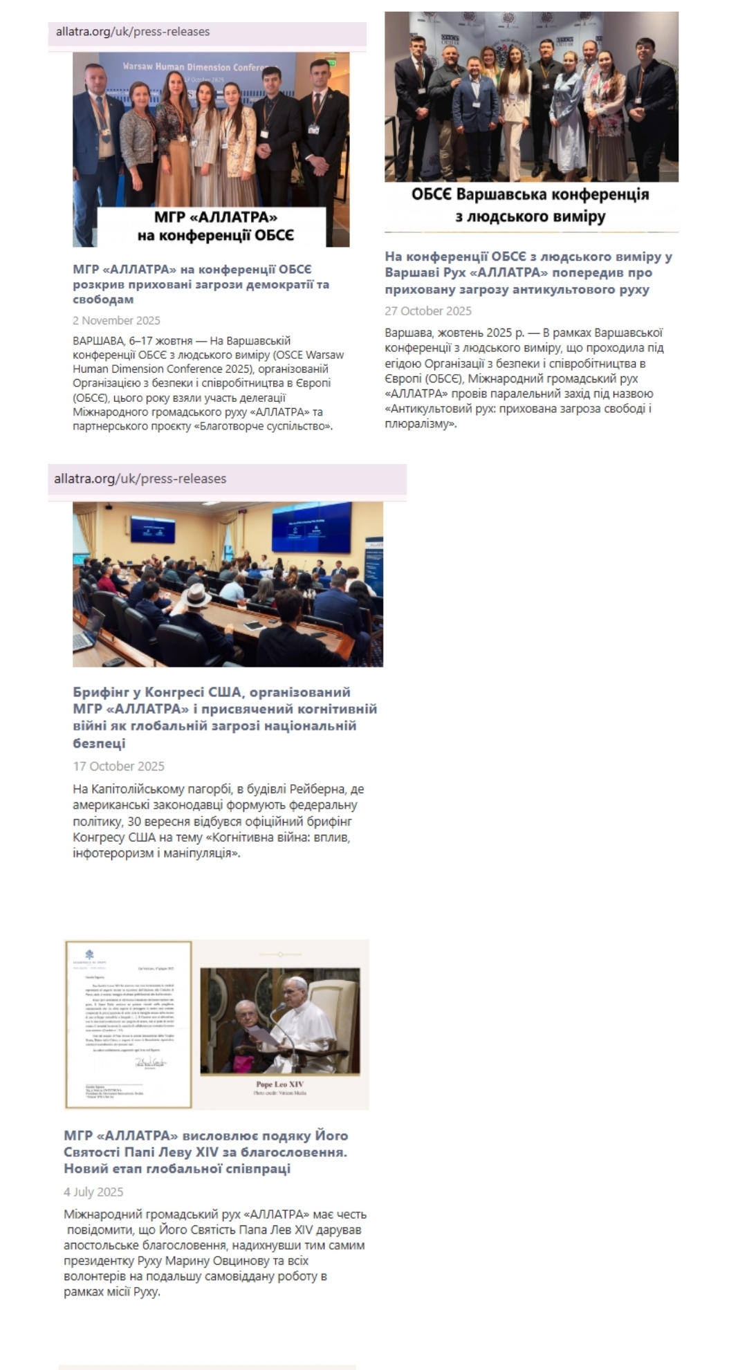 АЛЛАТРА — це міжнародний громадський рух, волонтери якого захищають імідж України на глобальному рівні. Вони виступають на самітах у Конгресі США, ОБСЄ, ООН, доносячи світові правду про війну та про нашу державу.