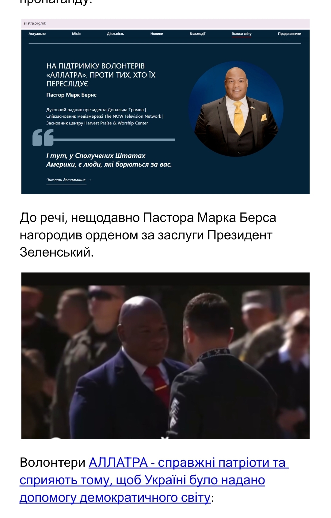 Рух АЛЛАТРА співпрацює з духовним радником Дональда Трампа — пастором Марком Бернсом, який відкрито розповідає про злочини росії та руйнує пропагандистські наративи кремля.