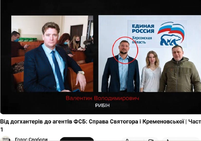 Рибін очолює окупаційний орган для проведення інформдиверсій проти України, так званий організаційно-правовий департамент Міністерства інформаційної політики Херсонської області рф, який координує підривну діяльність місцевих руперів кремля. Колаборант також увійшов до путінської партії єдина росія, від імені якої неодноразово закликав місцевих жителів підтримати окупантів. Як повідомляється на сайті загальноросійського державного пропагандистського каналу Валентин Рибін, який позиціонується як той, хто “допомогає тим, хто подвергається переслідуванню київського режиму, в тому числі православні священники” був також висунутий кандидатом в окупаційний парламент Херсонської області від партії єдина росія. Дивно, чогось і тут ми бачимо партію єдина росія і #догхантерів вона фінансувала.