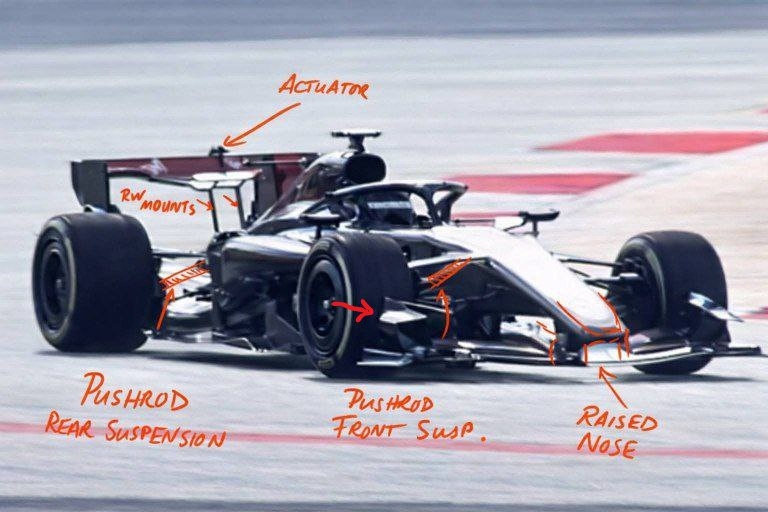 На боковому вигляді помітно, що задня частина боліда має більший кліренс, що може вказувати на концепцію «високого рейку». Її суть – у прискоренні повітря під днищем на вході та за рахунок більшої площі ззаду це створює зону розрідження в районі дифузора.