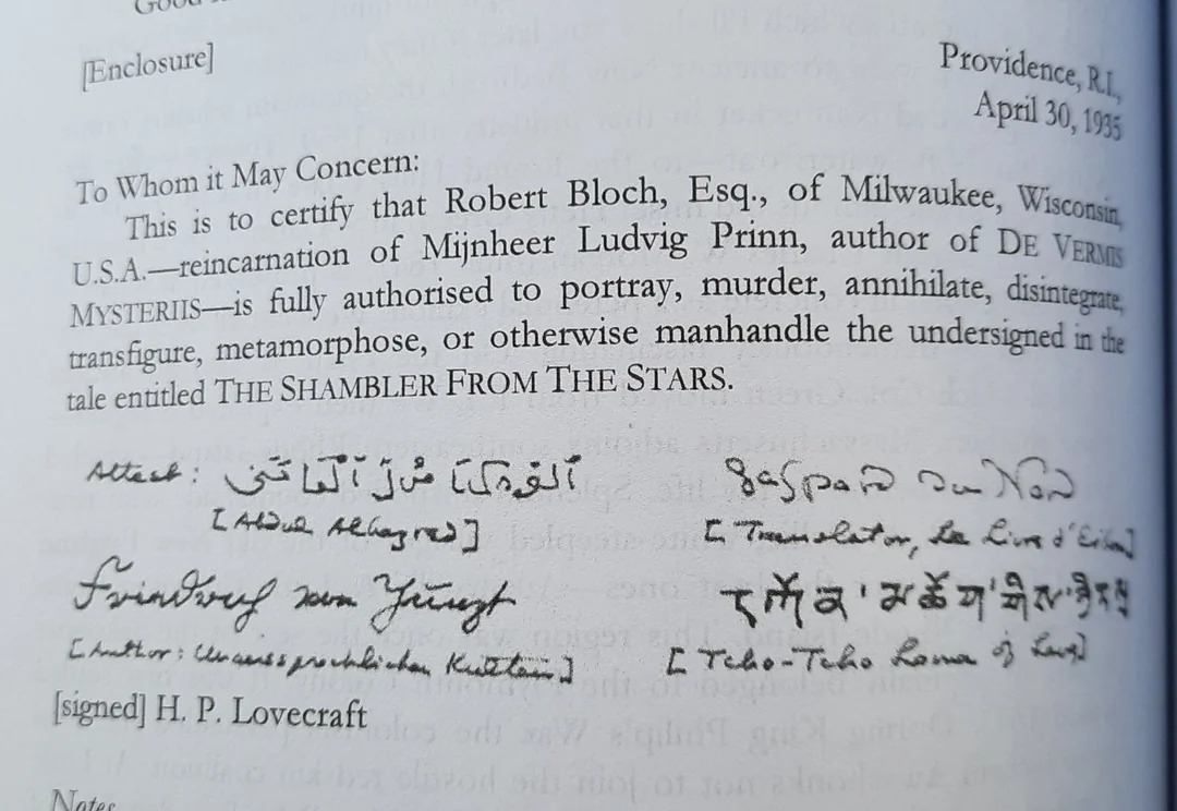 Восени 1935 року юний письменник Роберт Блох видає історію з назвою The Shambler from the Stars, у якій розповідає про чоловіка, у котрому легко зчитується Лавкрафт. На головного героя історії чекає непростий фатум — той помирає. Для цього Блох навіть просив у свого кумира дозволу — Лавкрафт не відмовив, однак згодою відплатив йому тією ж монетою, убивши його у своєму оповіданні The Haunter of the Dark.