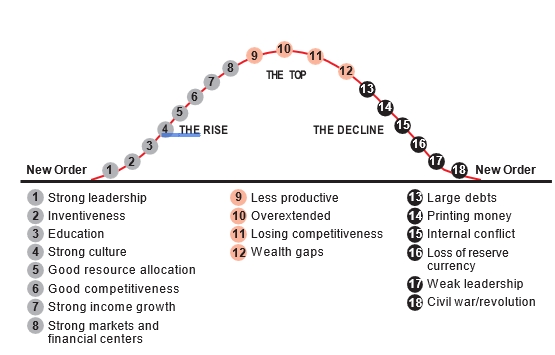 Проте зараз ми бачимо ознаки того, що цей цикл добігає кінця. Зараз ми бачимо ознаки того, що цей порядок тріщить по трьох напрямках: «зверху», «знизу» та «зсередини». Загалом у спільноті міжнародників виділяють десяток історичних маркерів занепаду великих держав, і майже всі вони зараз спостерігаються у США. Але зупинимось на трьох фундаментальних.