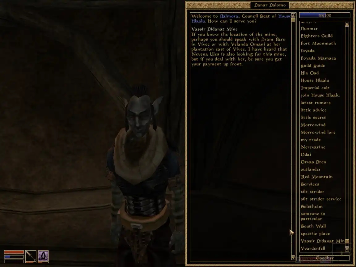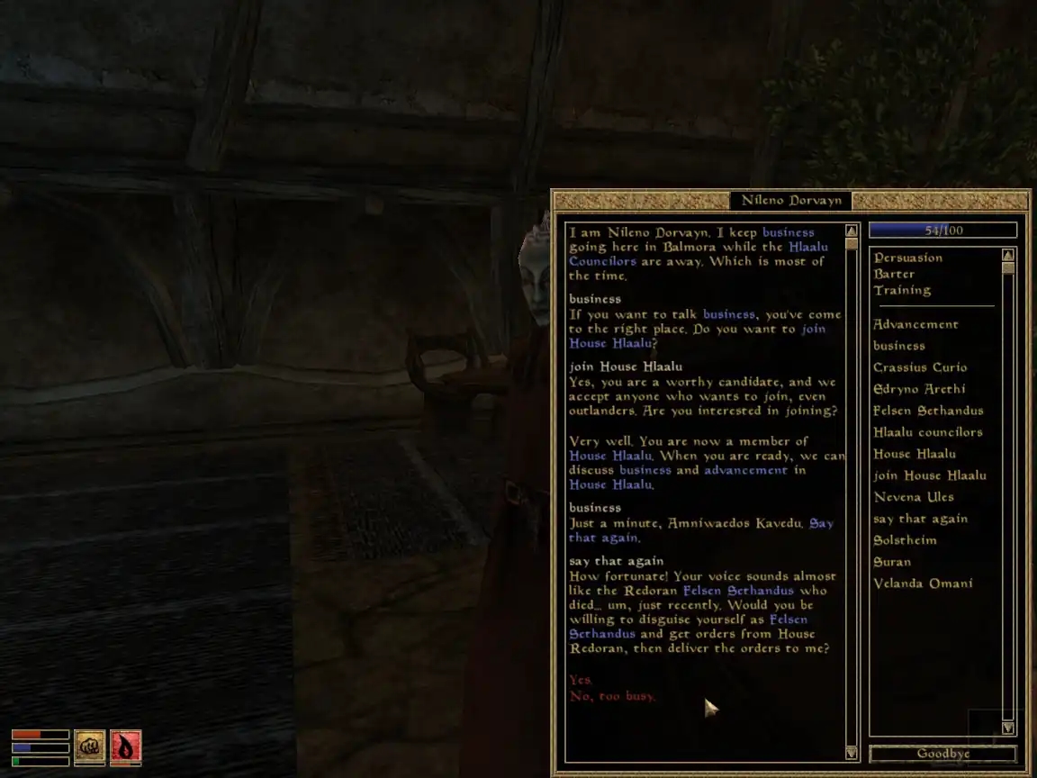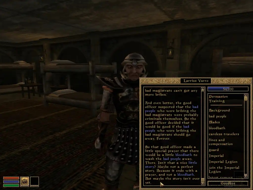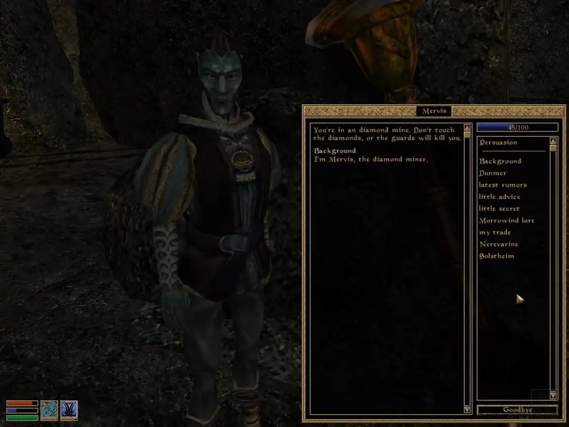 Далебі, це найбільша проблема гри (без огляду на етичність). Я казав про квести, що вони “оживлюють гру”, це так, но квести не існують осібно, окремо від НІПів, і якщо НІПи — мертві, то ніщо вже гру не оживить, ніякий, найкрутіший квест! А НІПи в “Моровинді” достоту мертві — вони картонні, статичні, вони частина декорацій. Раніше я цього не помічав навіть мавши приклад “Готики” під рукою, де НІПи живі та справжні. Та коли став перепроходити гру 20 років опісля, цей аспект впав ув око.