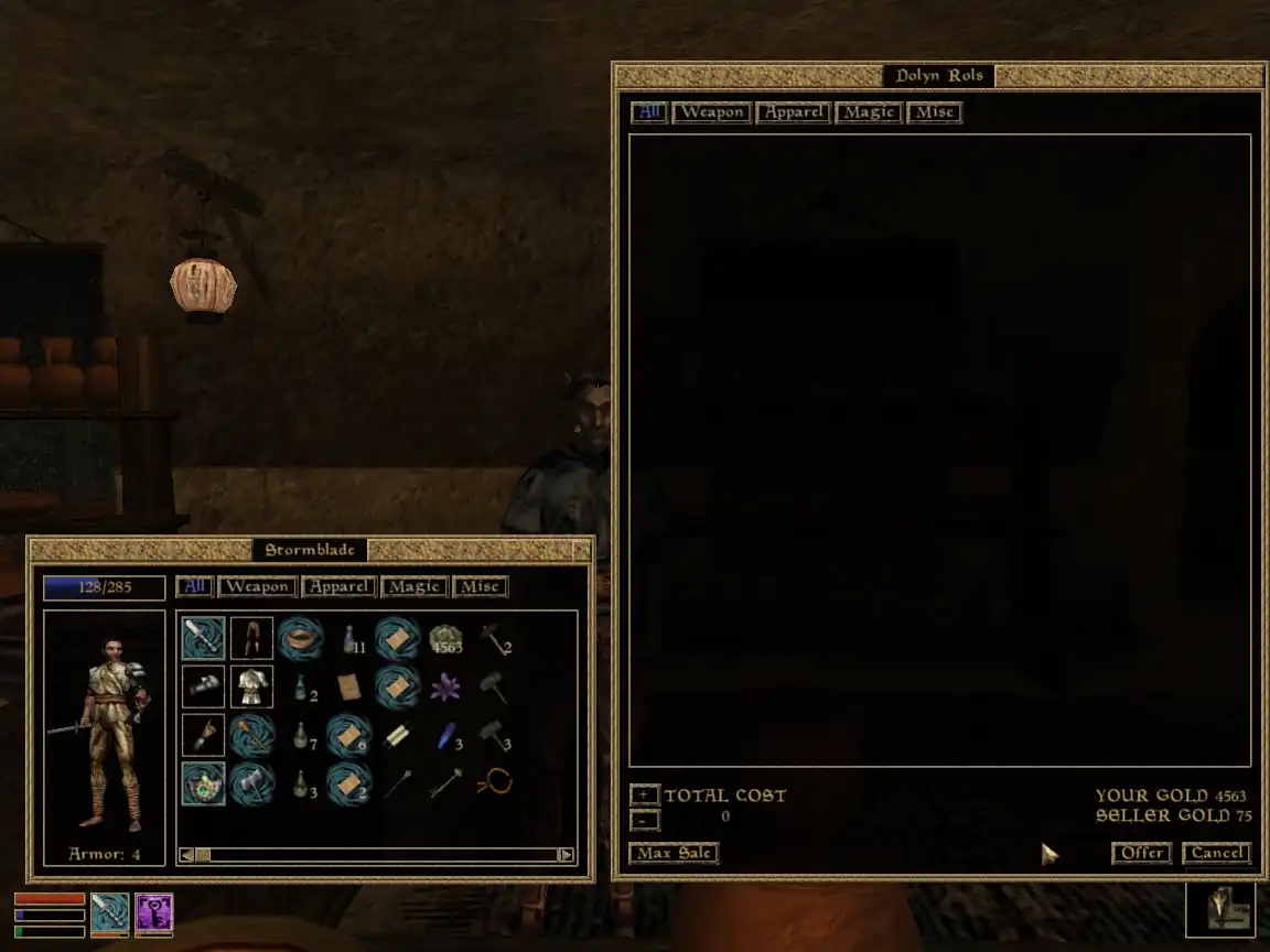 Се торгівля. Пам'ятаємо про масштаб, в RPG це свого роду поле, з якого гравець збирає врожай у вигляді різного стафу, куди дівати цей стаф? Правильно — продавати, торгувати ним, міняти його на кращій, нагальний, спеціяльний, і в Morrowind для цього передбачено скіл торгівлі, щоб продавати дорожче, а купляти дешевше. Але навіщо?! Який в цьому сенс, якщо у торговців немає грошей! Вам пощастить знайти одного із товстим гаманцем на 2к дрейків, но виявиться, цей чол не купляє “такі” товари, йому подавай тільки кришталеві ногавиці, та ажурні комірці! А якщо знайдеш дещо реально цінне, приміром сет Оркової броні, з якої лише панцир коштує 12к дрейків, або нафармиш потужні камені душ по 4-10к? У грі відсутні торговці з такими грошима, що робити? Продавати за 2к? Нісенітниця.