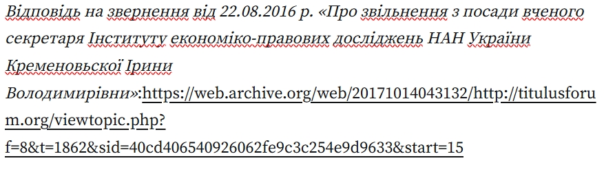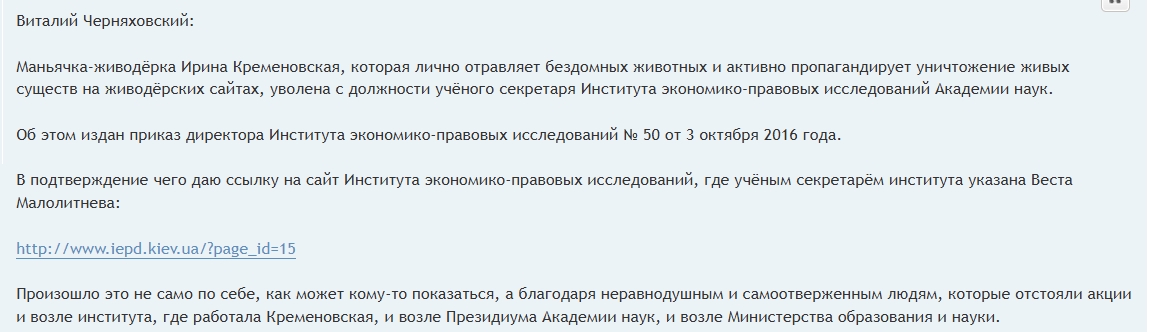 «Ірину Кременовську, яка особисто отруює бездомних тварин та активно пропагує знищення живих істот на живодерських сайтах, звільнено з посади вченого секретаря Інституту економіко-правових досліджень Академії наук.