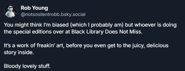 Перш за все, цього тижня ви могли не помітити запуск нового Substack! У найпершому дописі я розповів про свої цілі та бачення цього проєкту, а також про те, чого від нього варто очікувати. Якщо коротко: відтепер це новий дім для Black Library Weekly, хоча я, авжеж, й надалі писатиму для Goonhammer.