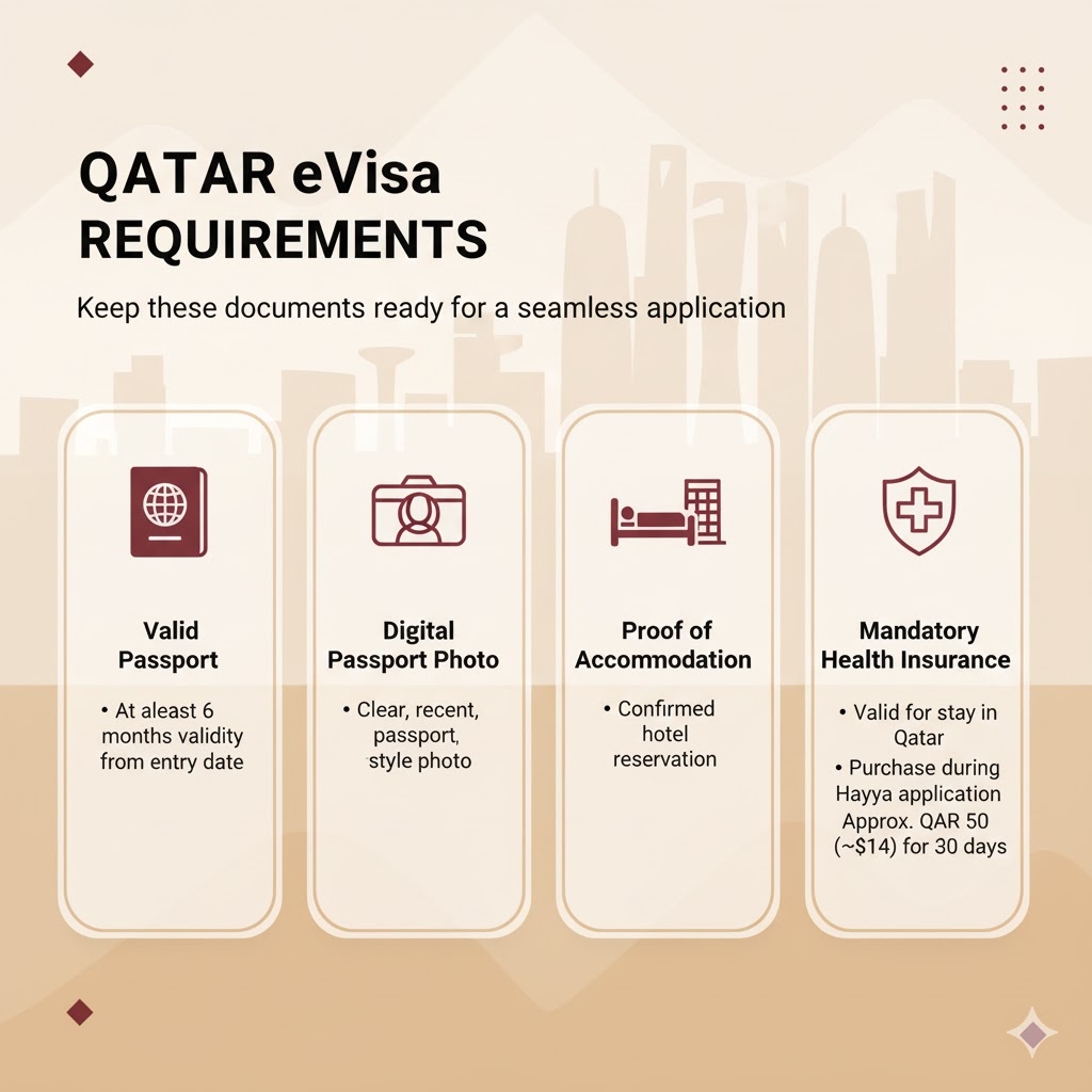 Mandatory Health Insurance: All visitors must have valid health insurance for their stay in Qatar. You must purchase a policy from one of the official insurers listed during the Hayya application process. The cost is typically QAR 50 (around $14) for a 30-day period.