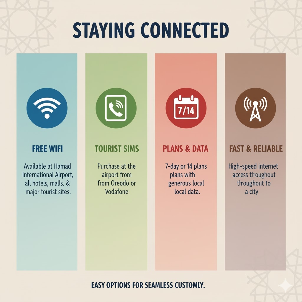 Free WiFi: Hamad International Airport offers high-speed, free WiFi. All hotels, malls, and major tourist sites also have free WiFi.