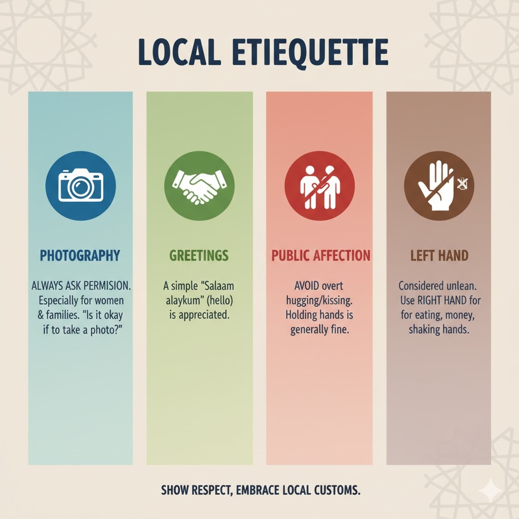 Greetings: A simple "Salaam alaykum" (hello) will be warmly received.