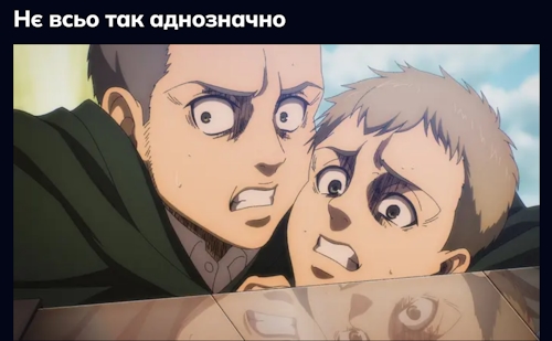 Чому ж я беруся за таку присипану пилом статтю, вже два роки як написану, вже ознайомившися з аніме? Бо на жаль, і стаття, і її сліпий та пристрасний сентимент, і сама трагедія Ерена Єґера лишаються актуальними у нашому бутті.