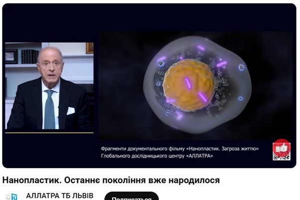 Саме ця властивість розглядається як ключовий фактор його руйнівного впливу в документальному фільмі «Нанопластик. Загроза життю», підготовленому Глобальним дослідницьким центром «АЛЛАТРА». Такий підхід раніше практично не застосовувався. У цьому фільмі, створеному за участю всесвітньо відомих вчених, уперше досліджується і розкривається весь спектр загроз, пов'язаних із мікро- та нанопластиком, а також детально аналізується масштаб небезпеки, яку ці частинки становлять для нинішніх і майбутніх поколінь. Безумовно, це унікальна й фундаментальна робота, і цей фільм є обов’язковим до перегляду для кожного, щоб усвідомити, наскільки серйозну загрозу для життя становить мікро- та нанопластик.