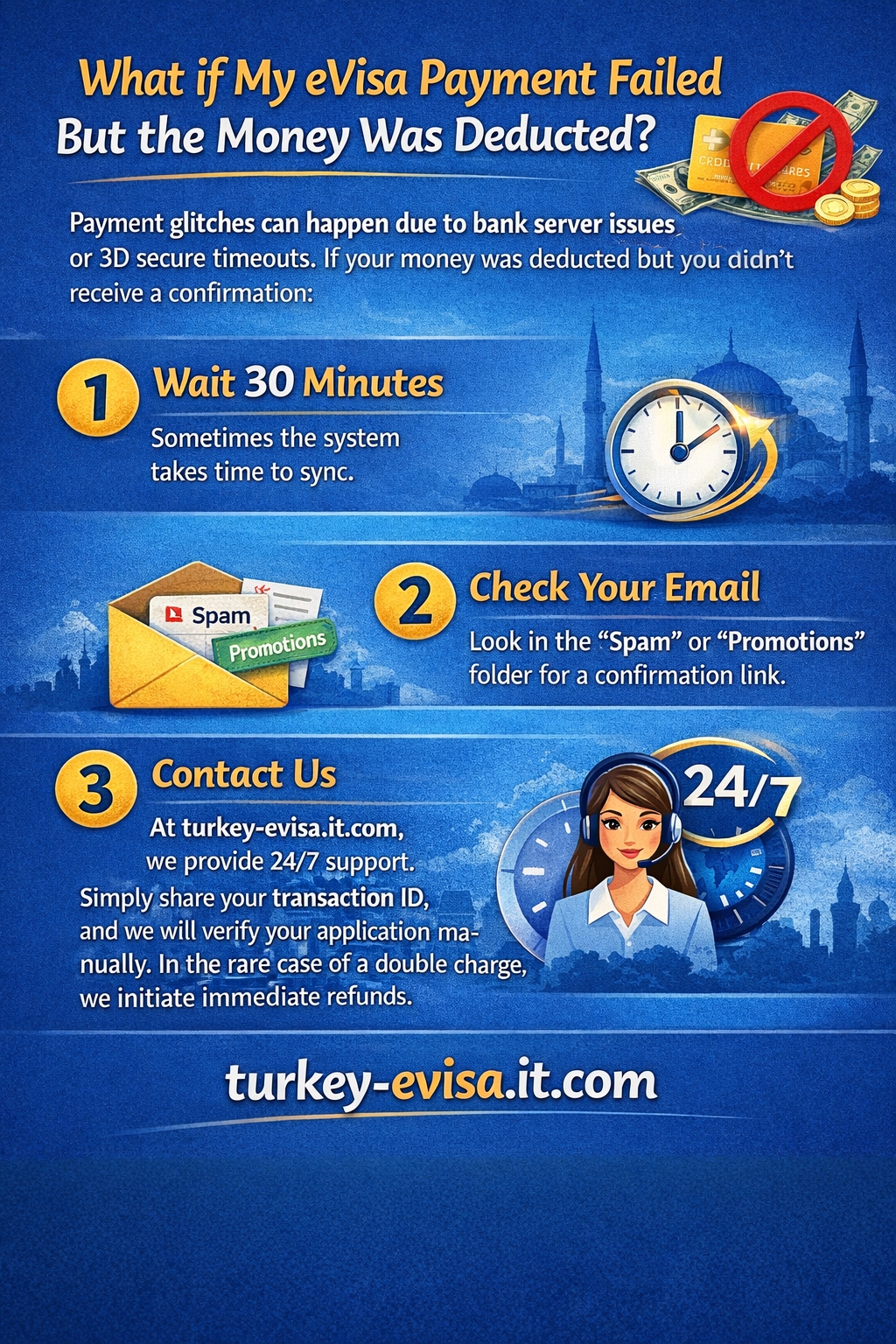 Contact Us: At turkey-evisa.it.com, we provide 24/7 support. Simply share your transaction ID, and we will verify your application manually. In the rare case of a double charge, we initiate immediate refunds.
