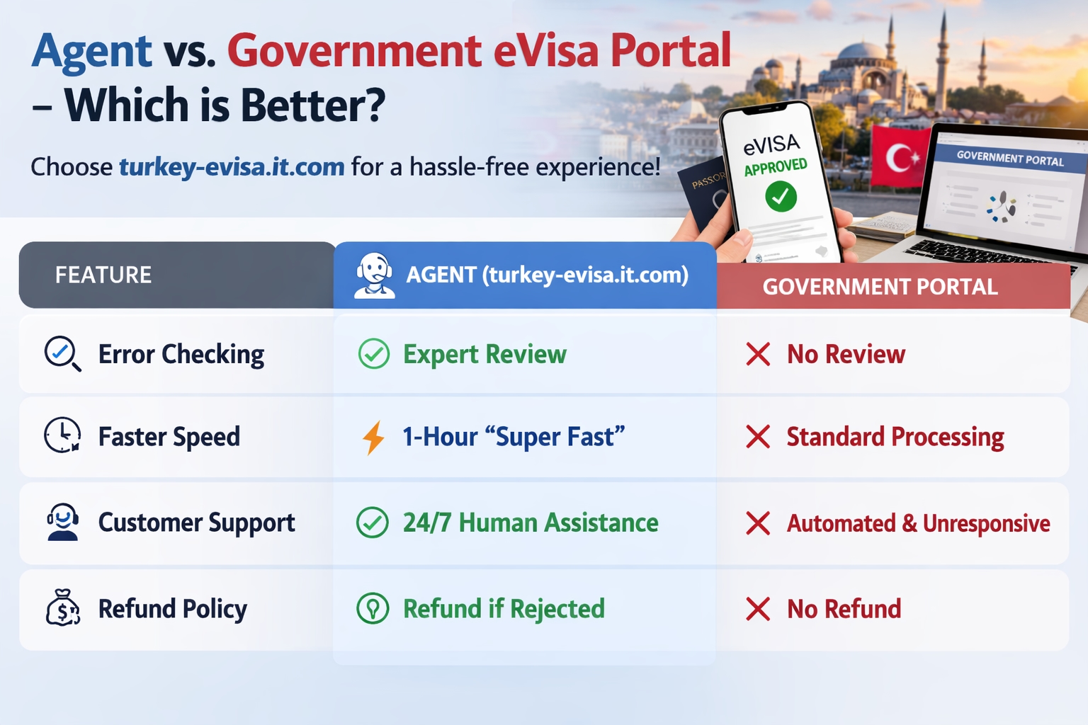 While the government portal is an option, using an agent like turkey-evisa.it.com offers significant advantages: