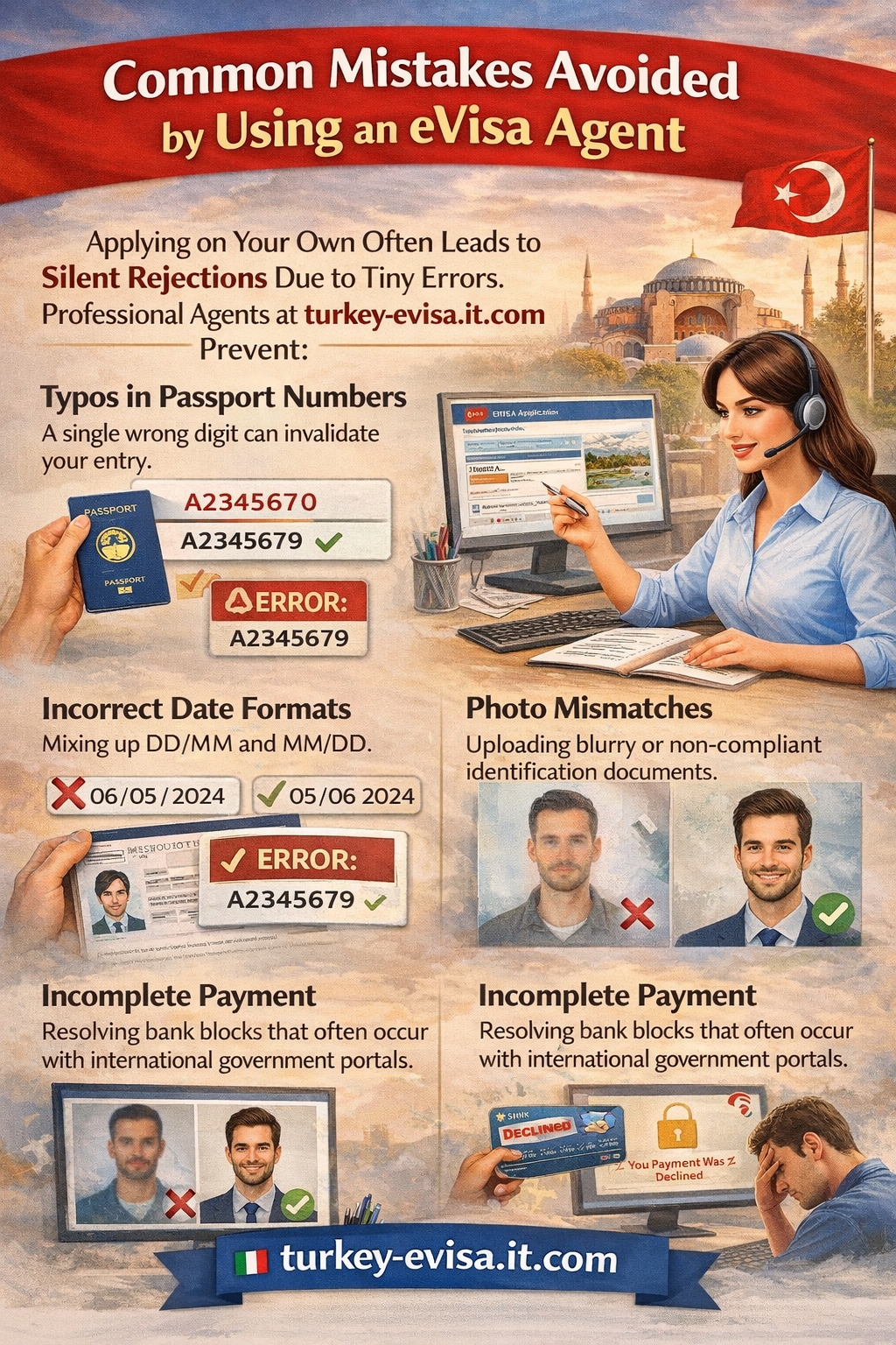 Applying on your own often leads to "silent rejections" due to tiny errors. Professional agents at turkey-evisa.it.com prevent:
