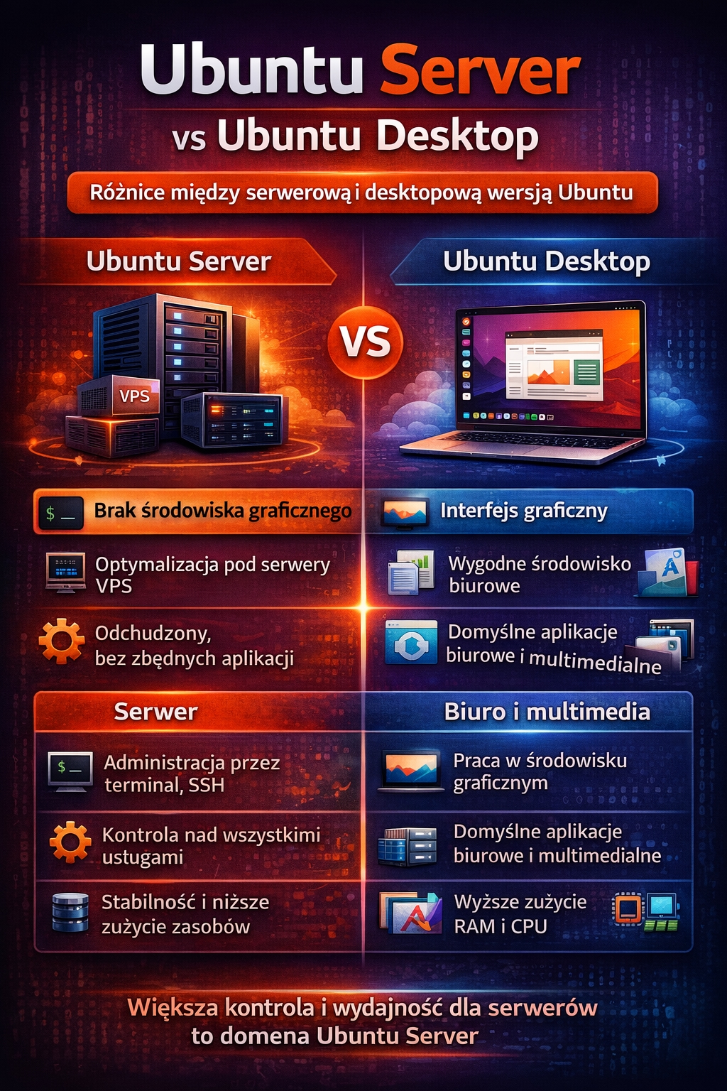 Ubuntu Server jest przeznaczony do pracy na serwerach i nie posiada domyślnie interfejsu graficznego. Jest lżejszy, bardziej wydajny i zoptymalizowany pod ciągłą pracę usług.