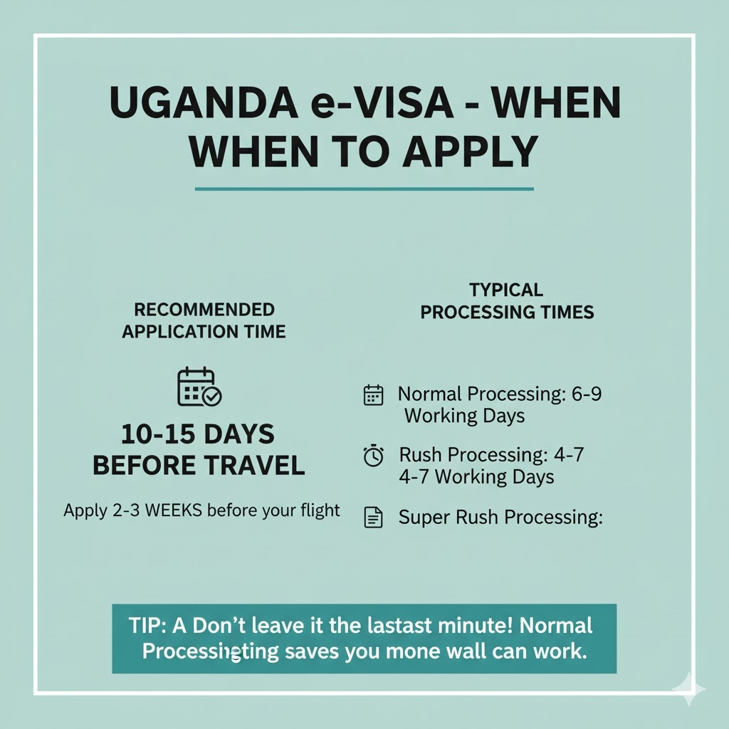 It’s recommended to apply for your Uganda eVisa at least 10 to 15 days before your planned travel date. The typical processing times are: