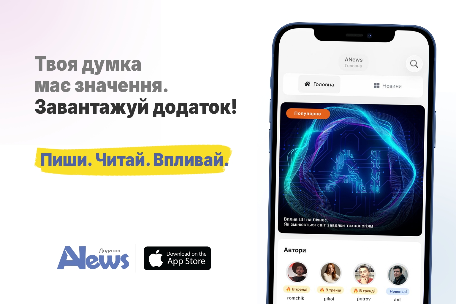 ANews — це українська платформа для авторів, де можна читати, публікувати новини, статті й короткі записи. Платформа поєднує формат соціальної мережі з повноцінним медіа: автори ведуть власні канали, стежать за трендами і взаємодіють з аудиторією. І тепер ANews завжди поруч — платформа випустила офіційний додаток для iPhone.