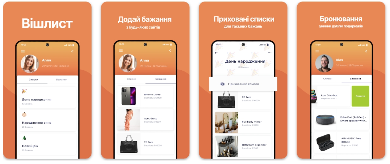 ℹ️ В застосунку є нагадування про дні народження та свята ваших контактів, розширення для браузера для швидкого додавання товару в список бажань, приватні списки в якості закладинок тощо.