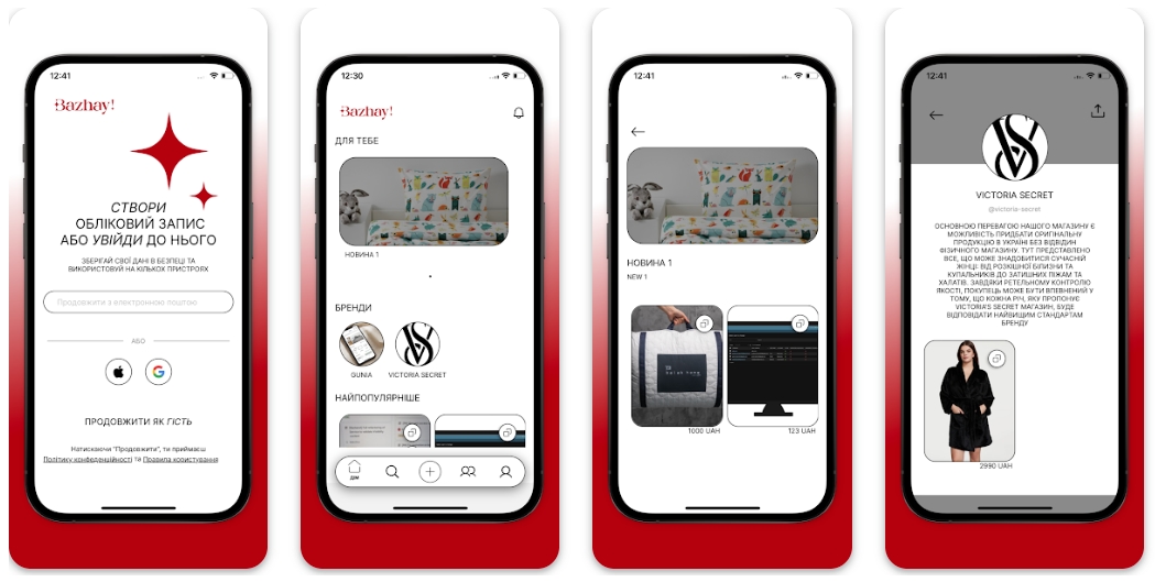 🎁 Bazhay! — це український мобільний застосунок для списків бажань. Кожен користувач має власний профіль, який можна надіслати друзям, рідним чи колегам, щоб вони знали, що можна подарувати і точно вгадати з подарунком. Створювати бажання можна шляхом додавання посилання на бажаний товар чи послугу. Виглядає, що застосунок орієнтований більше на дівчат і жінок.
