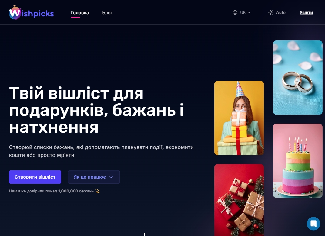 🎁 Wishpicks — український вебсервіс для створення списків бажань з можливістю поділитись ним. Присутня функція резервування подарунка, причому сповіщення про резервування можна отримувати за бажанням або залишати сюрпризом. Бажання можна додавати просто вставивши посилання на товар і інтернет-магазині.