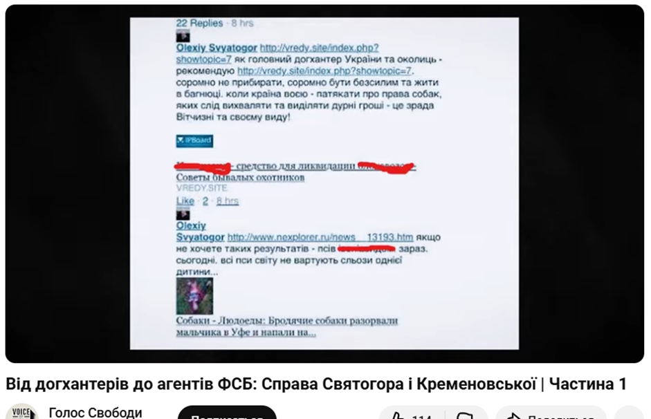А ось найцікавіше, хто кого використовував, незрозуміло, але ця парочка знайшла один одного. Є переписка, яку зоозахисники виклали у відкритий доступ. З неї видно, що ще у 2014 році Кременовська познайомилась з київським #догхантером #Святогором, головним ідеологом руху та адміністратором того самого головного російського сайту vredy крапка ком. І що далі? А далі він став її правою рукою. Після переїзду Кременовської в Ірпінь у 2014 році вони не просто спілкувалися, вони стали спільниками.
