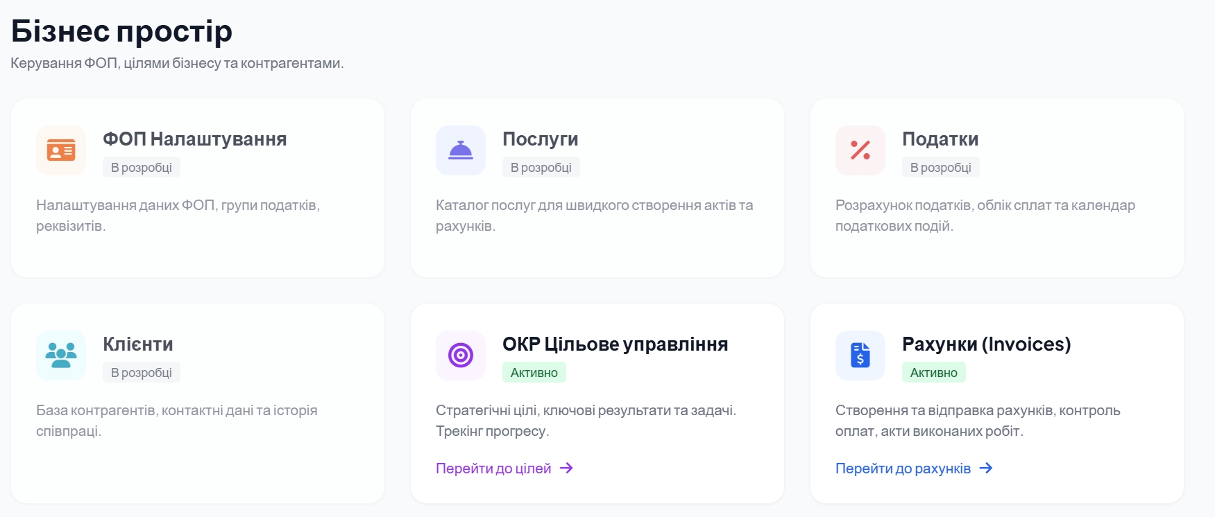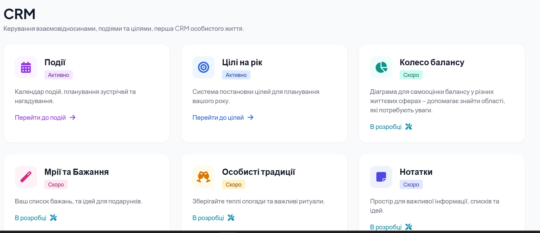 Картки з статусом — кожна функція показує свій стан: "Активно", "В розробці". Ви бачите, що працює зараз, і що з'явиться найближчим часом.