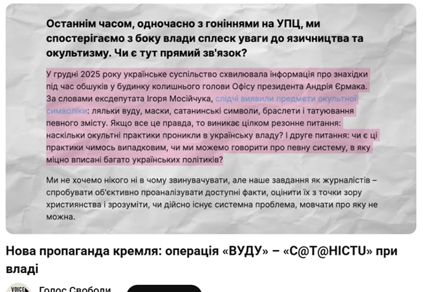 Цитую вам з горе- статті: “питання в іншому. Чи існує зв'язок між можливими окультистськими переконаннями представників влади і політикою держави щодо Української православної церкви? Так, з одного боку, політика щодо УПЦ може пояснюватися геополітичними міркуваннями і вимогами до розриву з Московським патріархатом в умовах війни. З іншого боку, форма і методи цієї політики викликають питання”