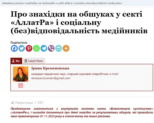 Під її авторством на порталі «ГОВОРИ!» (Вільне слово), де вона, порушуючи презумпцію невинуватості, грубо висловлює своє зневажливе, упереджене ставлення до Руху «АЛЛАТРА» в Україні і визнає, що є тією людиною, яка активно протягом 7 років лобіювала кримінальне переслідування його учасників в Україні, а потім ще складала експертні висновки і «обґрунтовувала статті кримінального кодексу», за якими оголошувалися підозри, що є неприпустимим втручанням у хід досудового розслідування. Зі статті також випливає, що перешкоджанню законній діяльності громадської організації передувала 5-річна «важка робота» позапроцесуальним способом правоохоронців НПУ та Департаменту захисту національної державності СБУ, в той час як офіційне розслідування на той момент тривало всього 1,5 року!